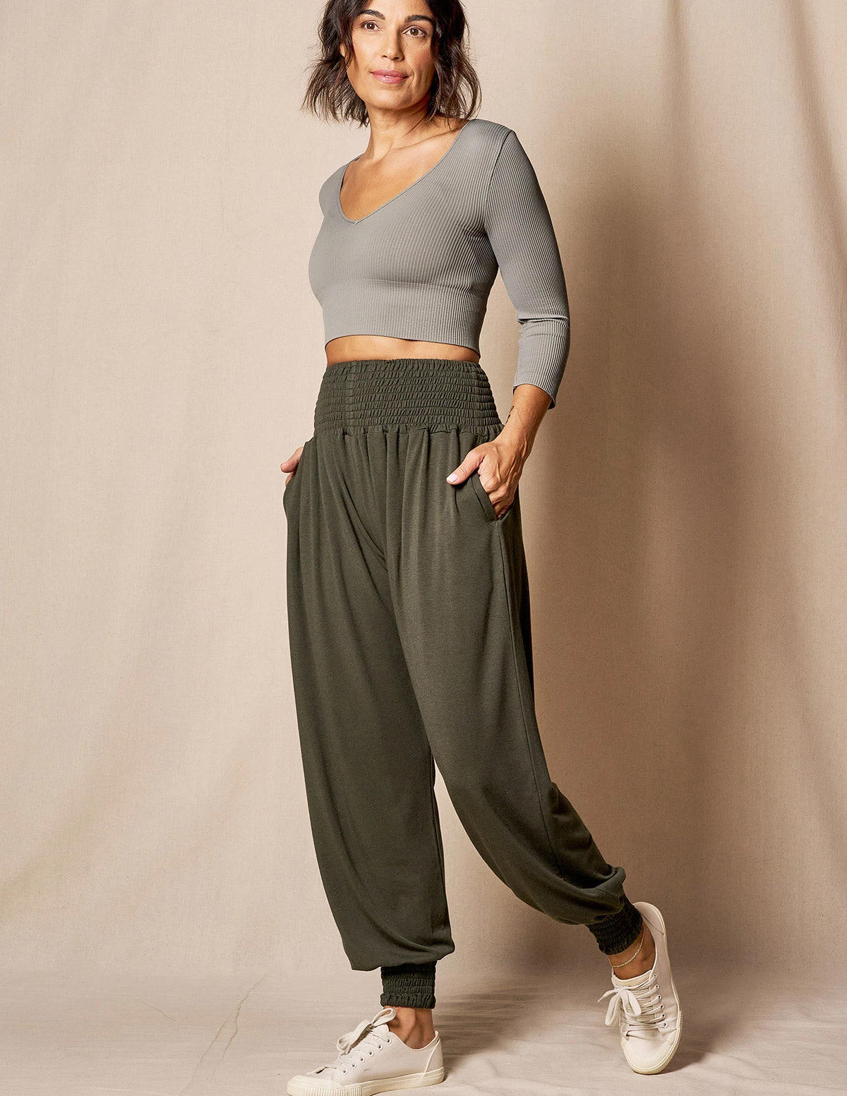 This bestseller just got even better! So many customers asked for pockets on our most popular pants, we had to do it. Premium bamboo and organic cotton knit with a smocked waist and cuffs for a super trendy look. Ideal for those with sensitive skin. Super soft with rich color and a luxurious feel.