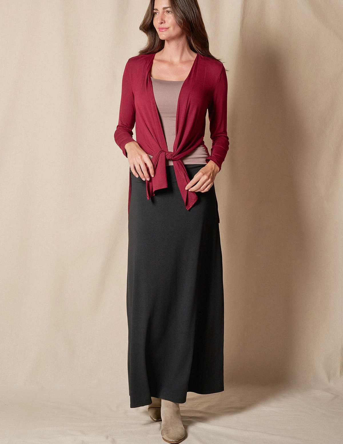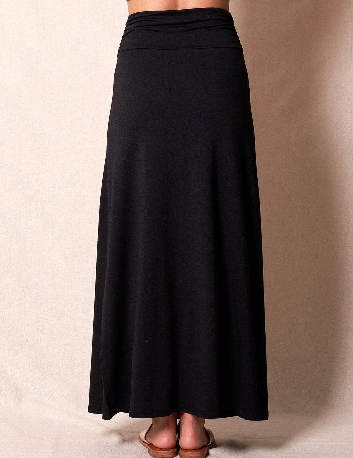 Our unique blend of bamboo and organic cotton makes this skirt the most comfortable for traveling. Features a ruched-shirred side waistband that adds a stylish note. Bamboo is ideal for those with sensitive skin. Super soft with rich color and a luxurious feel.Â