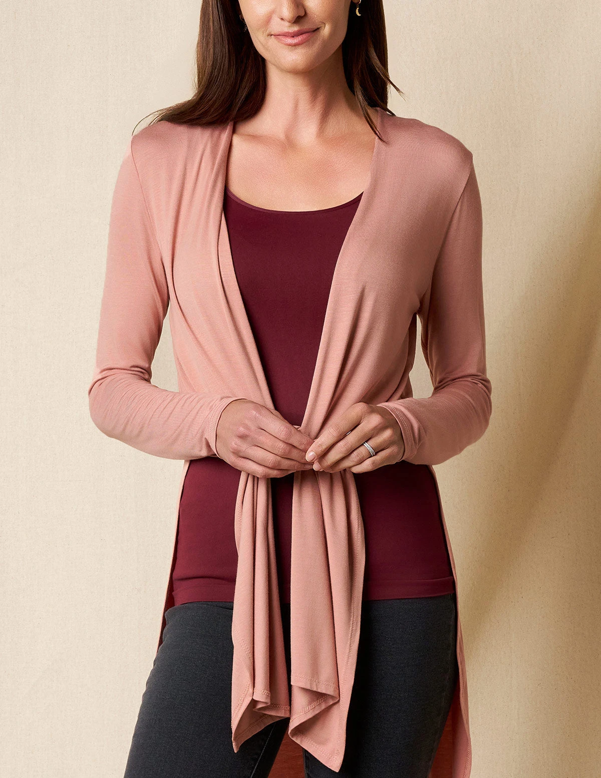 Bamboo Yoga Wrap calls for a laidback, throw-it-over, and walk-out-the-door approach to dressing. A light layer for a bit of warmth, a touch of luxury, and a whole lot of extra style. Wear straight with an open front or tie in front for an extra twist – either way, it looks fabulous over tank and leggings. Made from eco-friendly bamboo knit – soft, sustainable, antibacterial, and breathable.