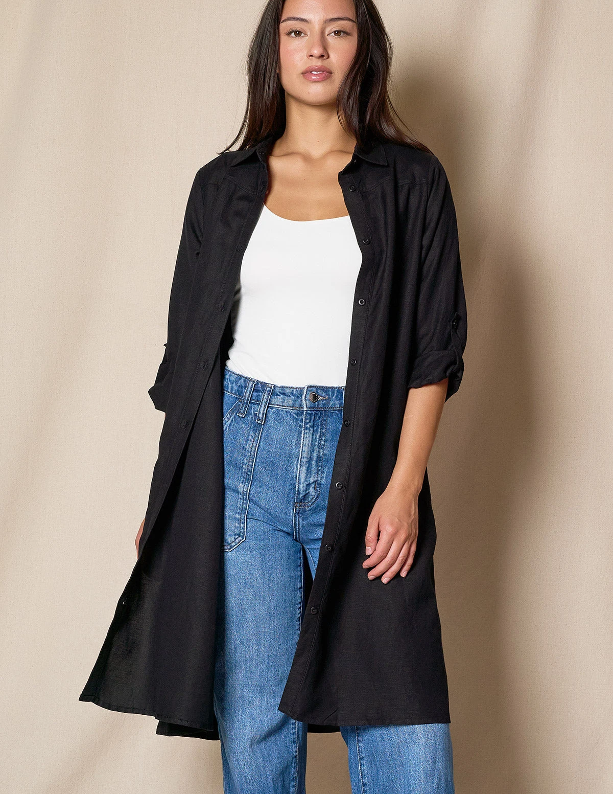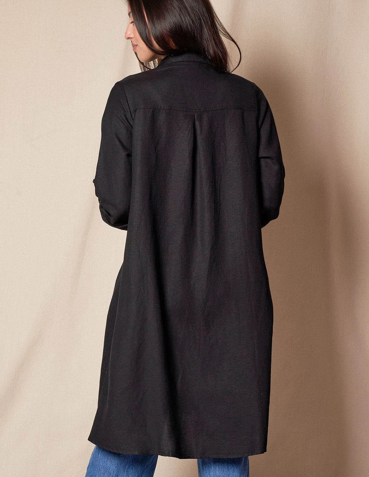 The elegance of linen and the softness of bamboo combine in our versatile new Linen/Bamboo Shirtdress to create a piece you will wear and treasure for a long time. Designed to resist wrinkling with the addition of bamboo, this dress stays crisp and fresh all day long. A classic, relaxed silhouette when worn as a dress or layered over pants and tops as a casual long jacket/duster.